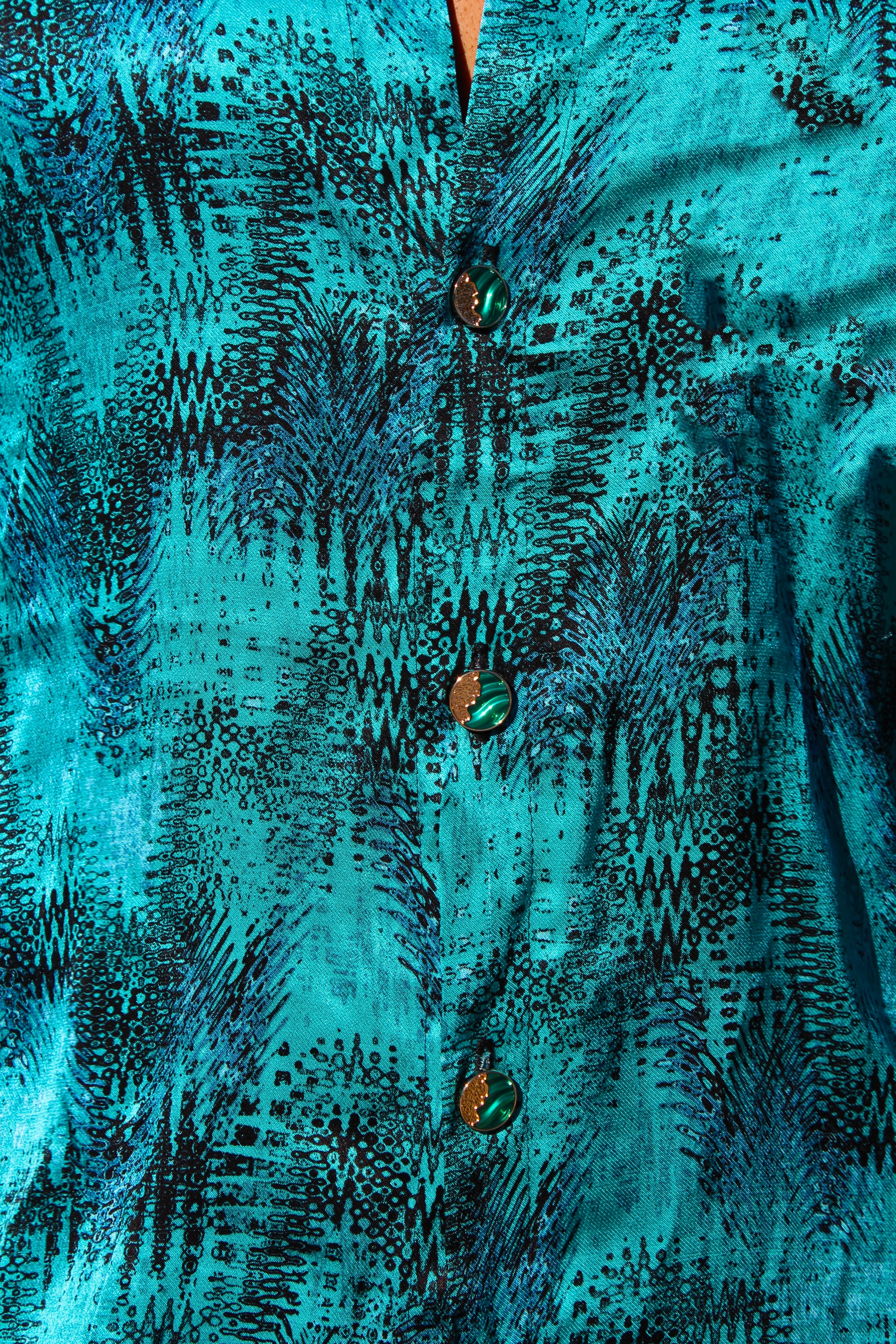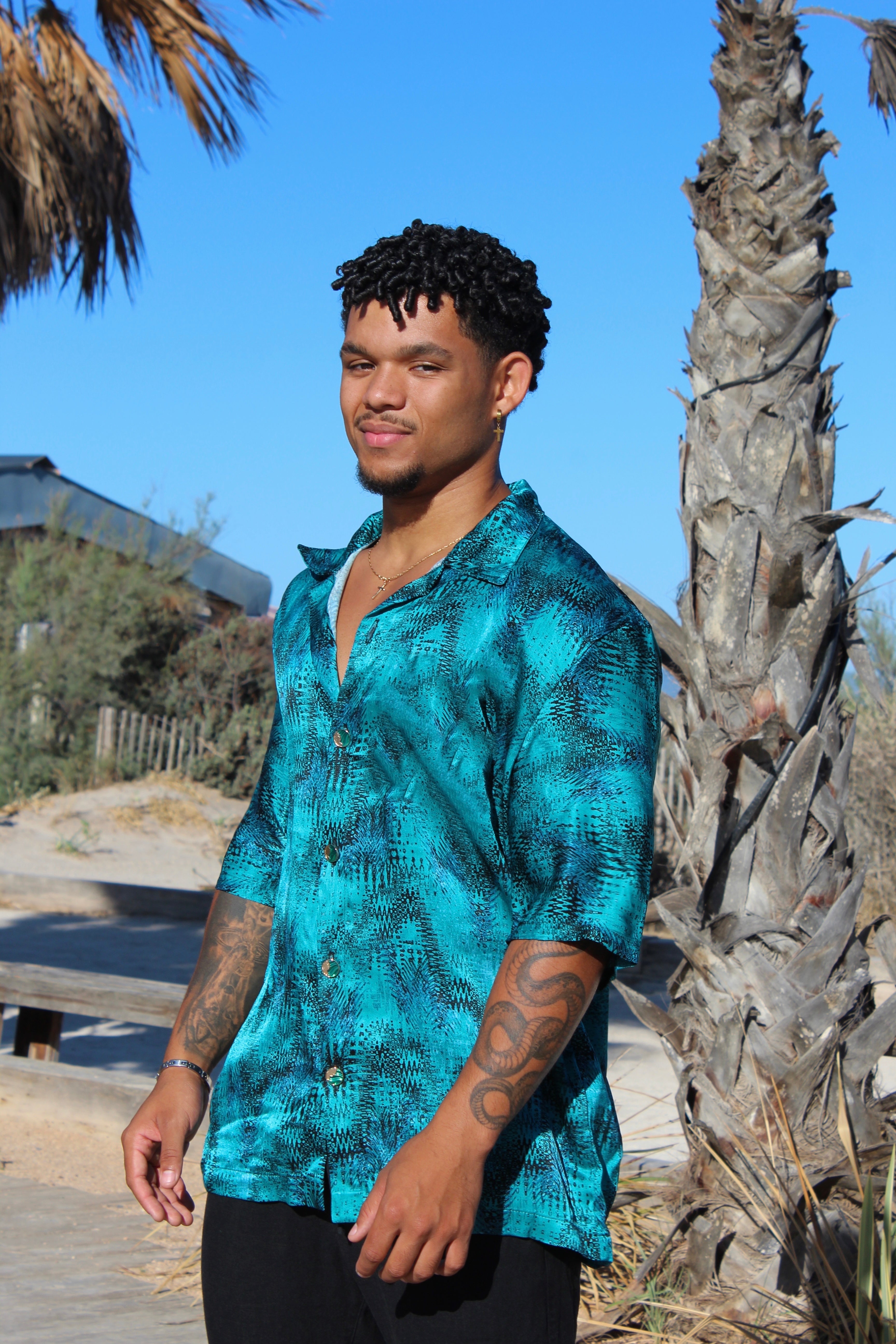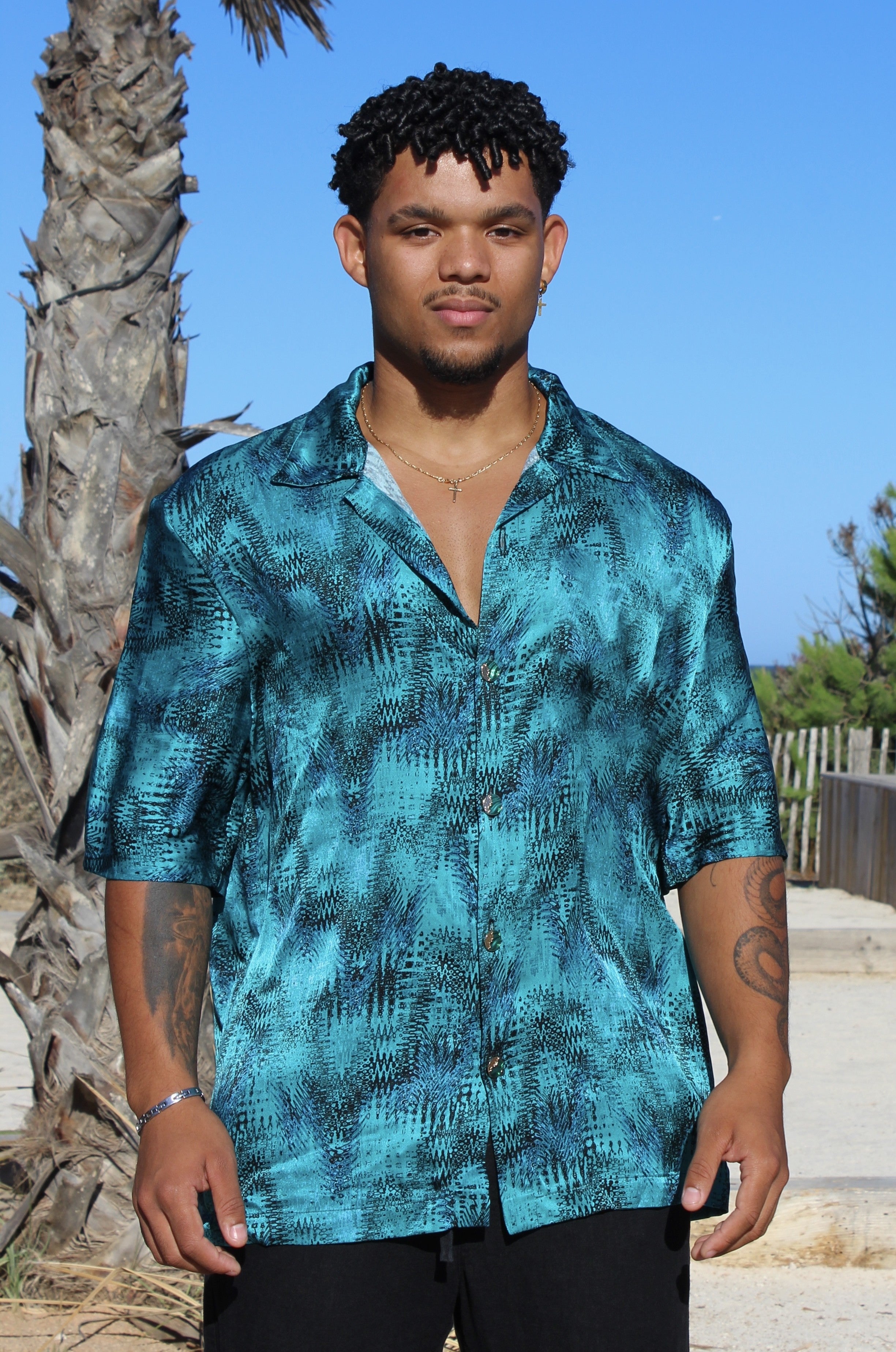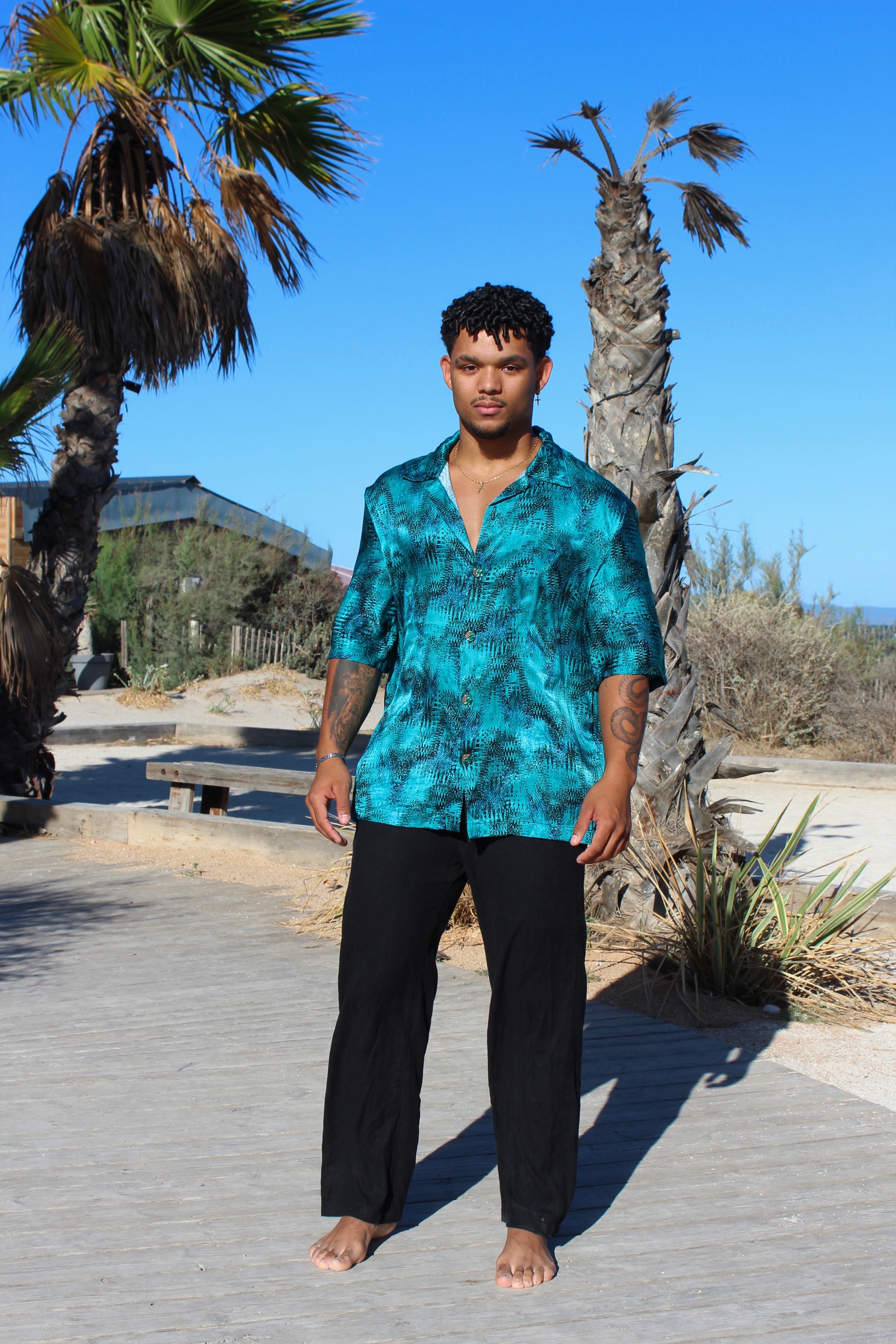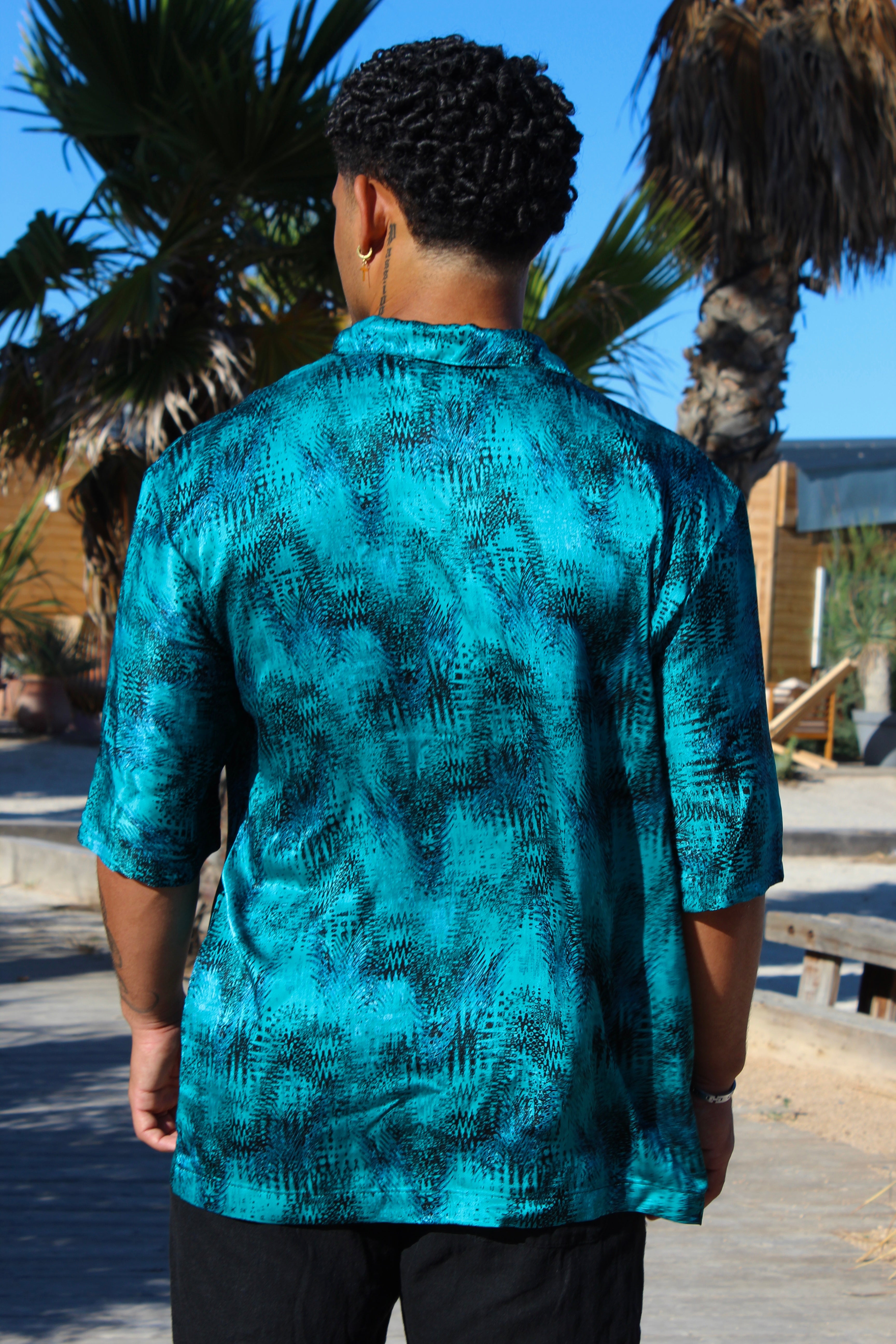 Chemise turquoise foncée aux motifs tropicaux qui rappelle l'eau des Caraïbes.