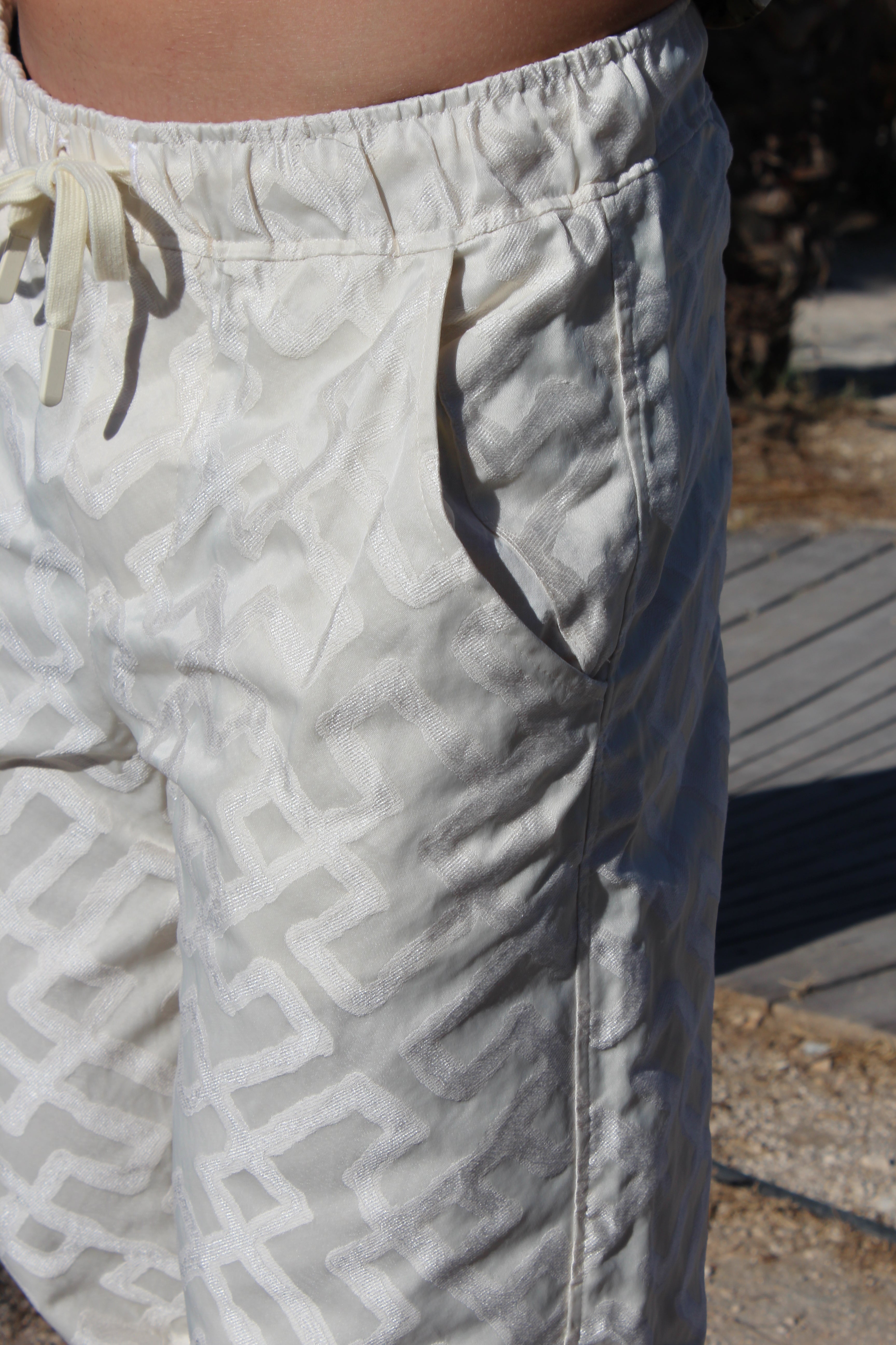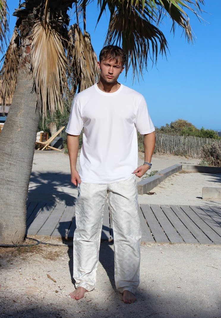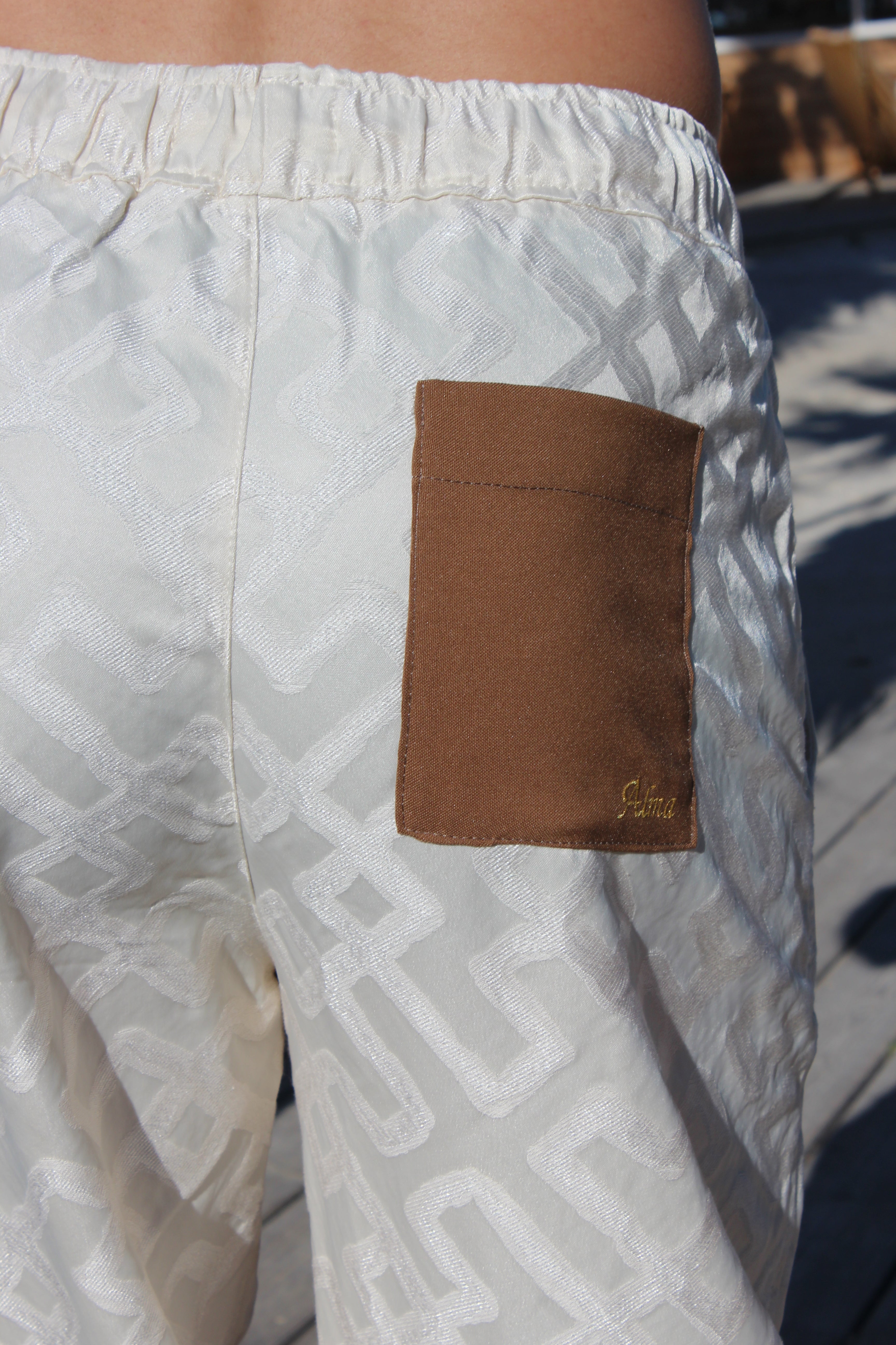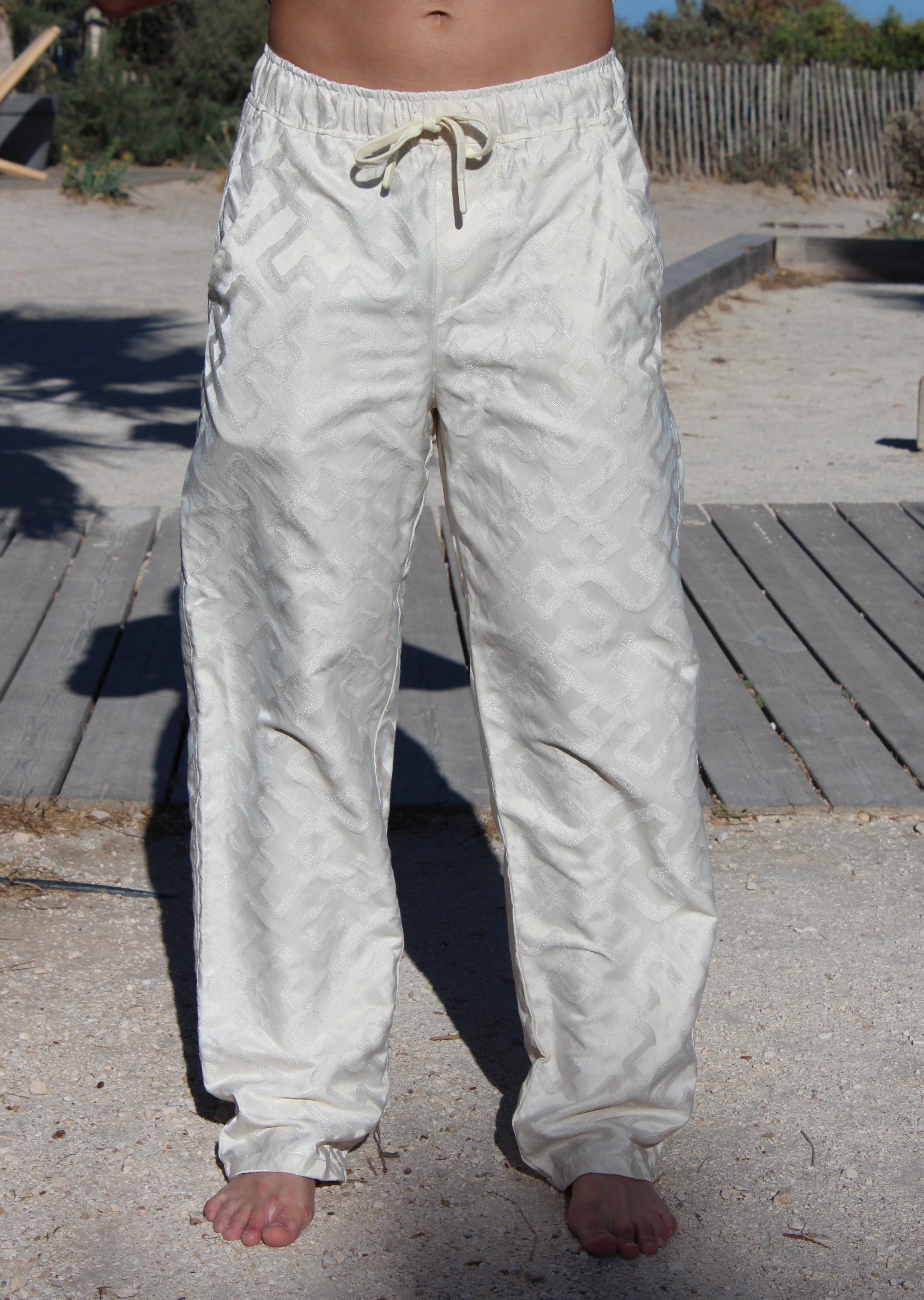 Pantalon Ivoire aux motifs satinés, coupe ample, pensé pour allier élégance et confort. Il capte la lumière avec délicatesse.