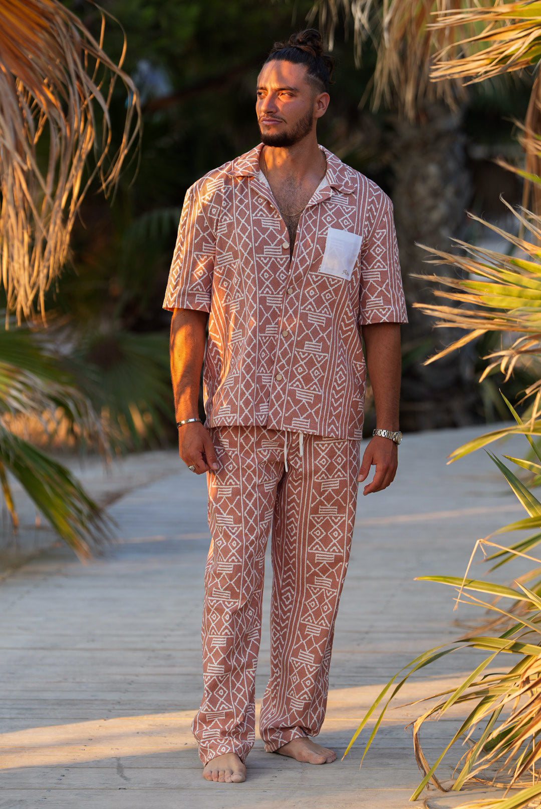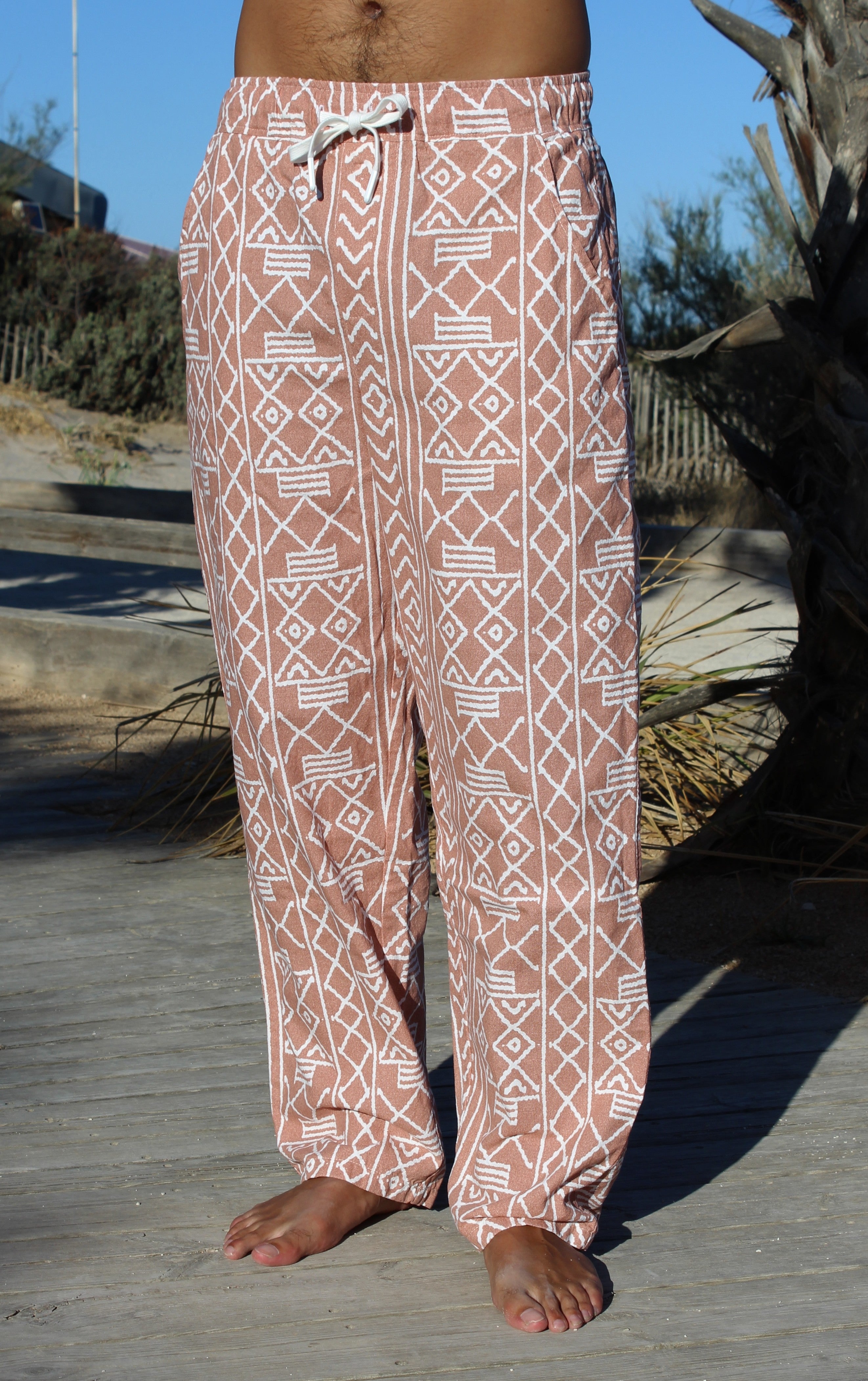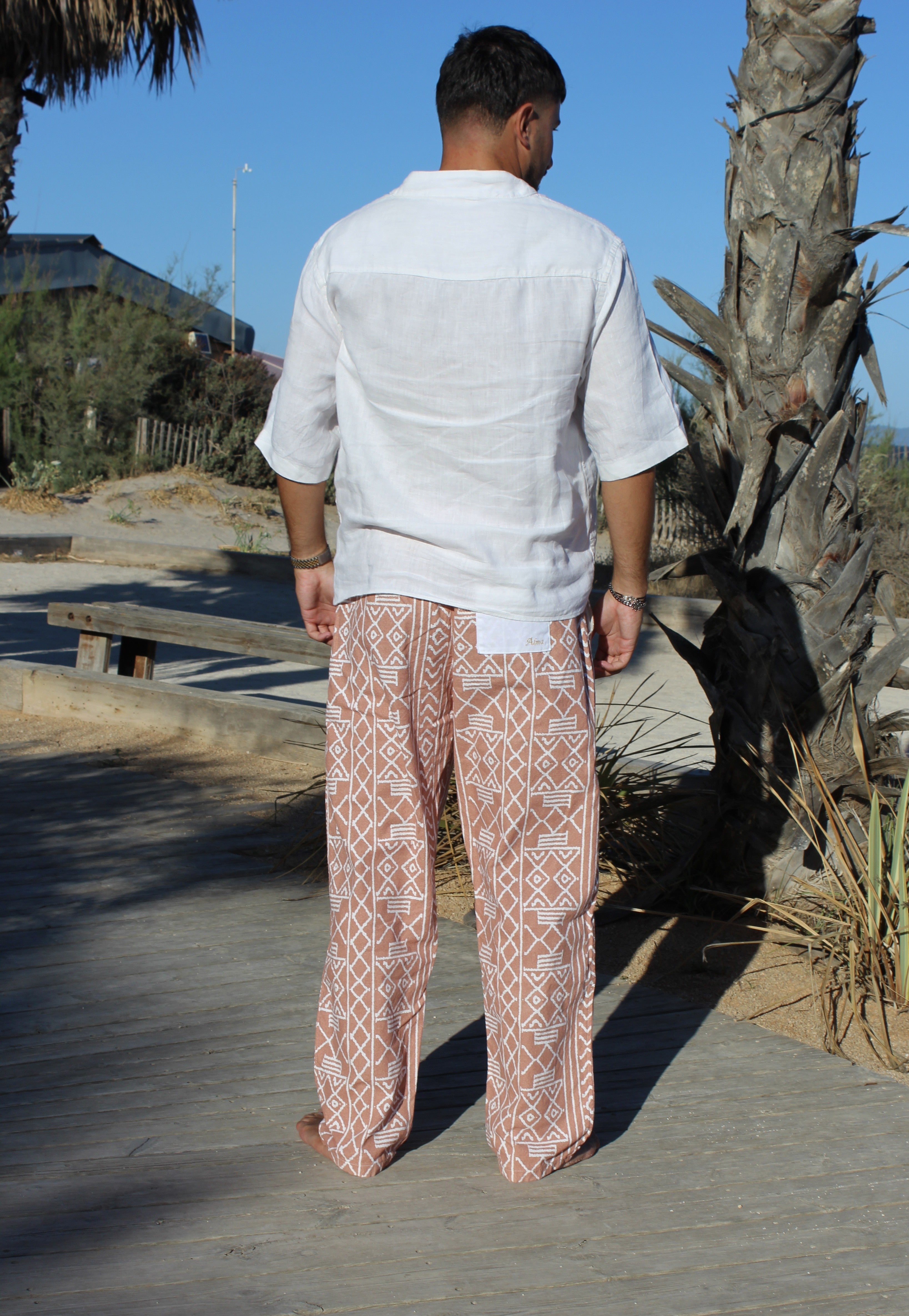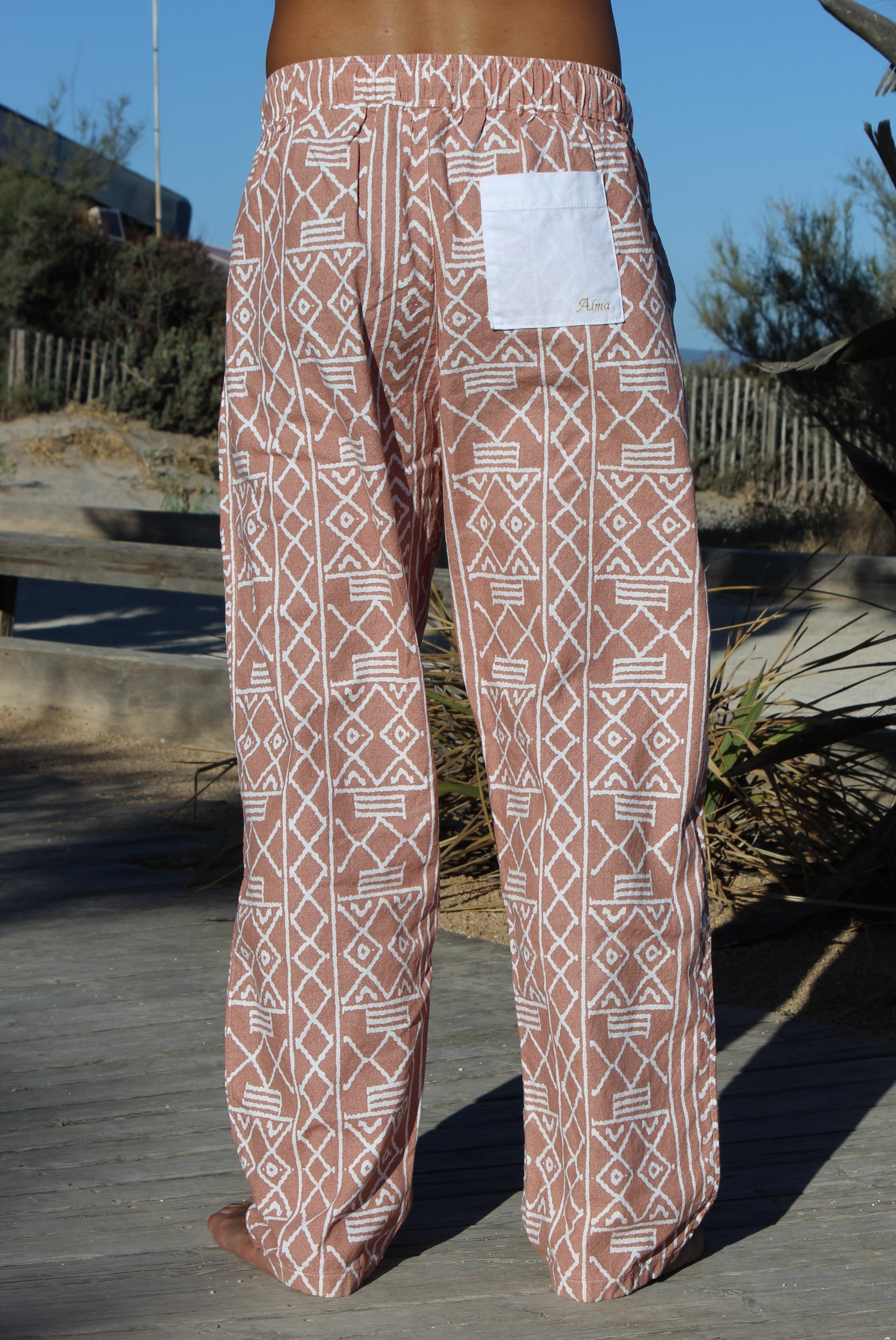 Pantalon aux motifs originaux, couleur qui rappelle la Méditerranée, coupe ample, pensé pour allier élégance et confort.